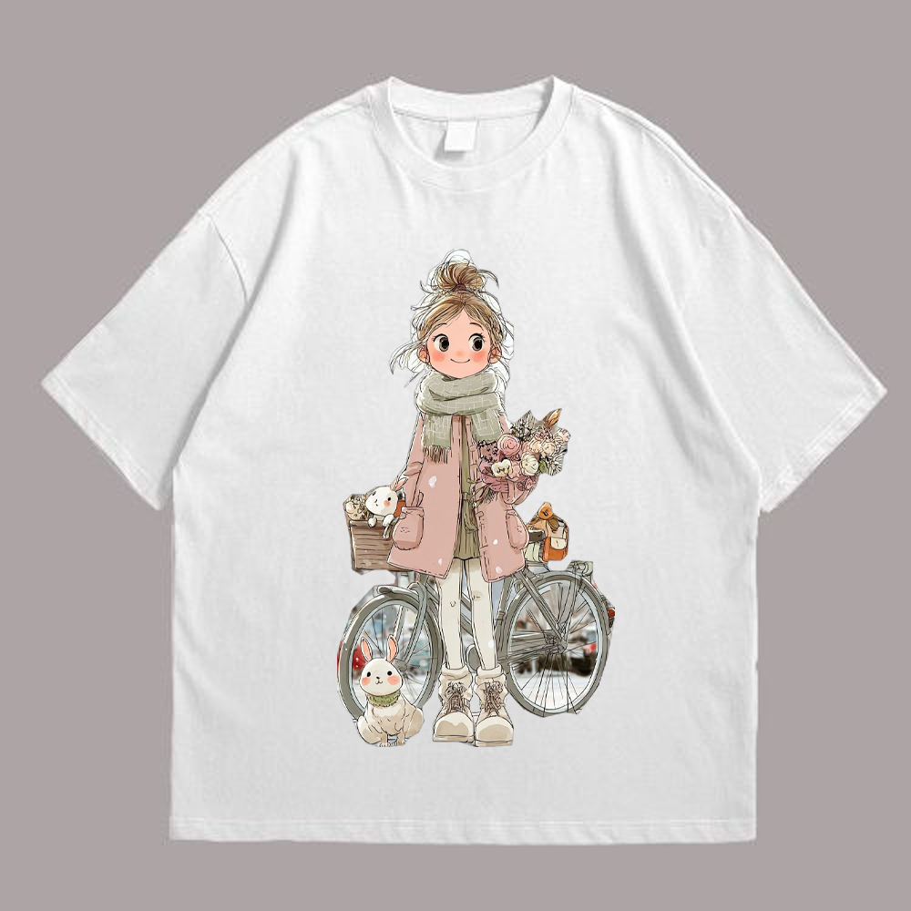 We use newest DTG Technology to print on to A girl with a rabbit and flowers.
