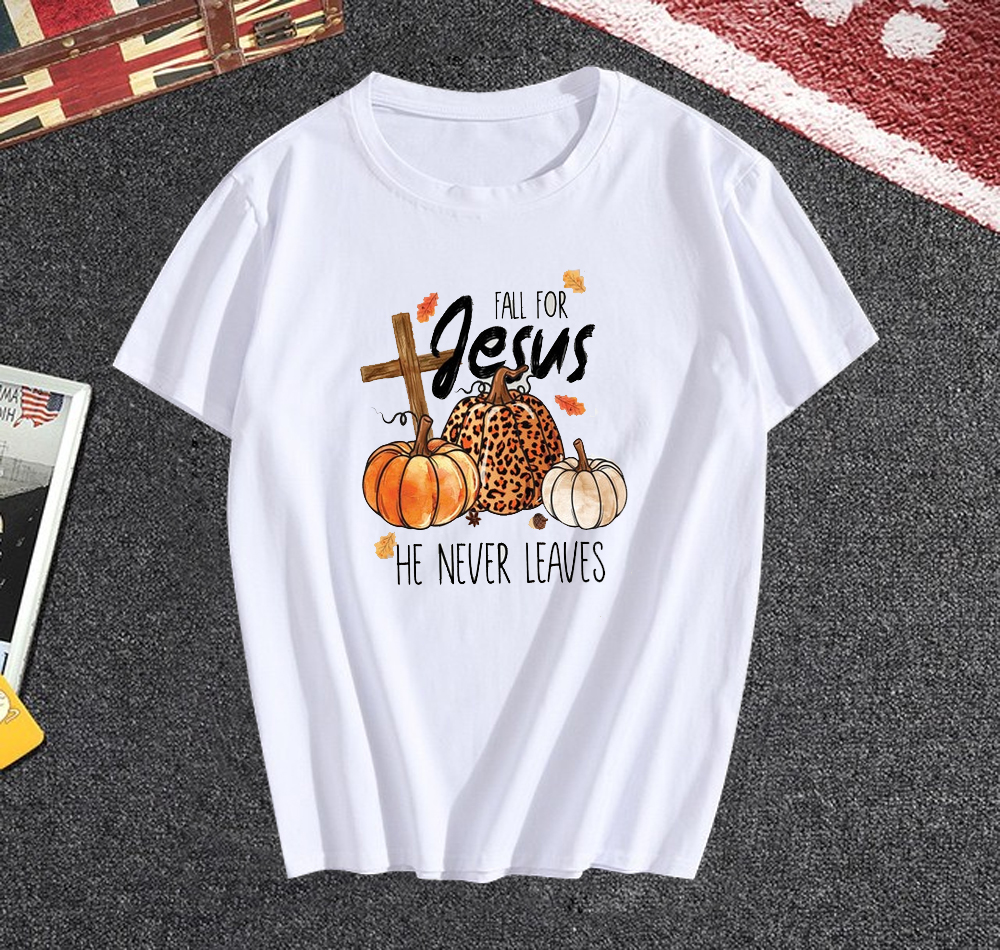 Buy Fall For Jesus He Never Leaves T-Shirt
