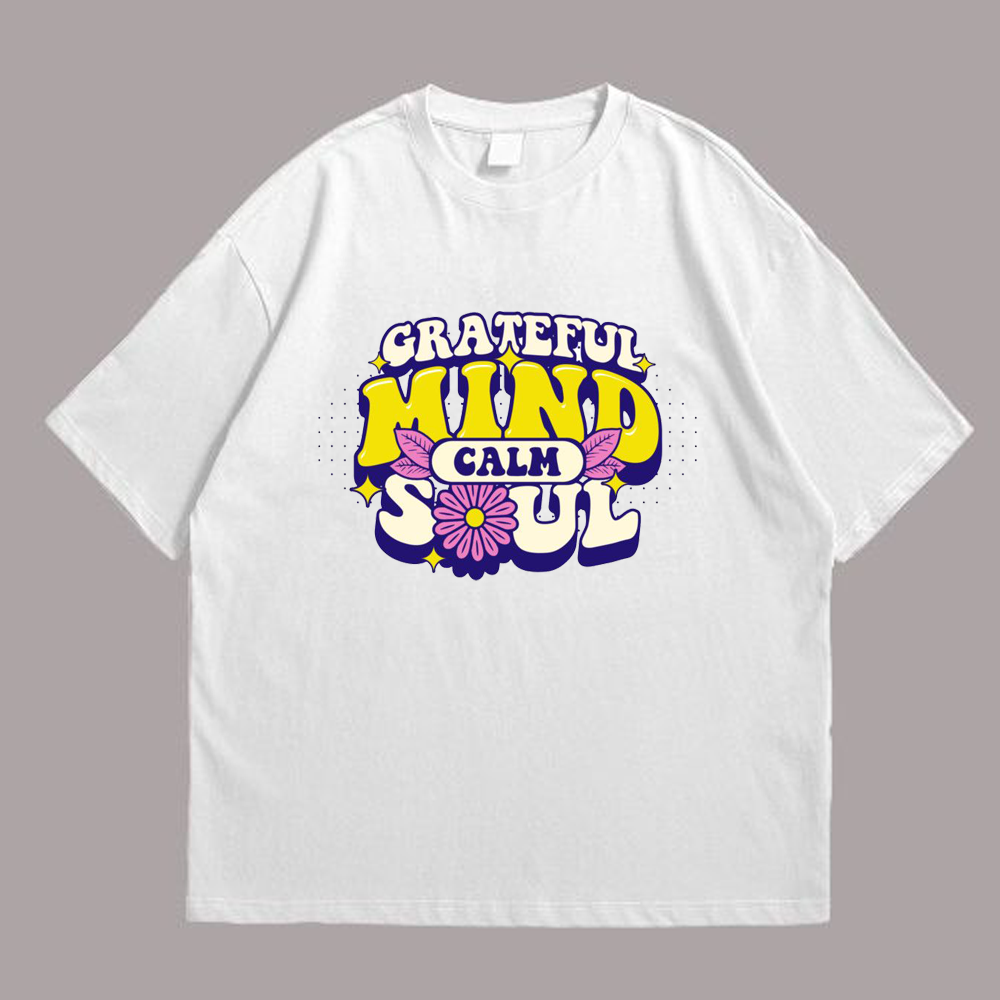 We use newest DTG Technology to print on to Grateful Mind Calm Soul Tshirt.