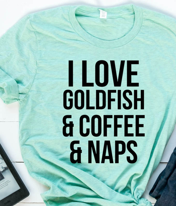 We use newest DTG Technology to print on to I Love Goldfish & Coffee & Naps T-shirt.